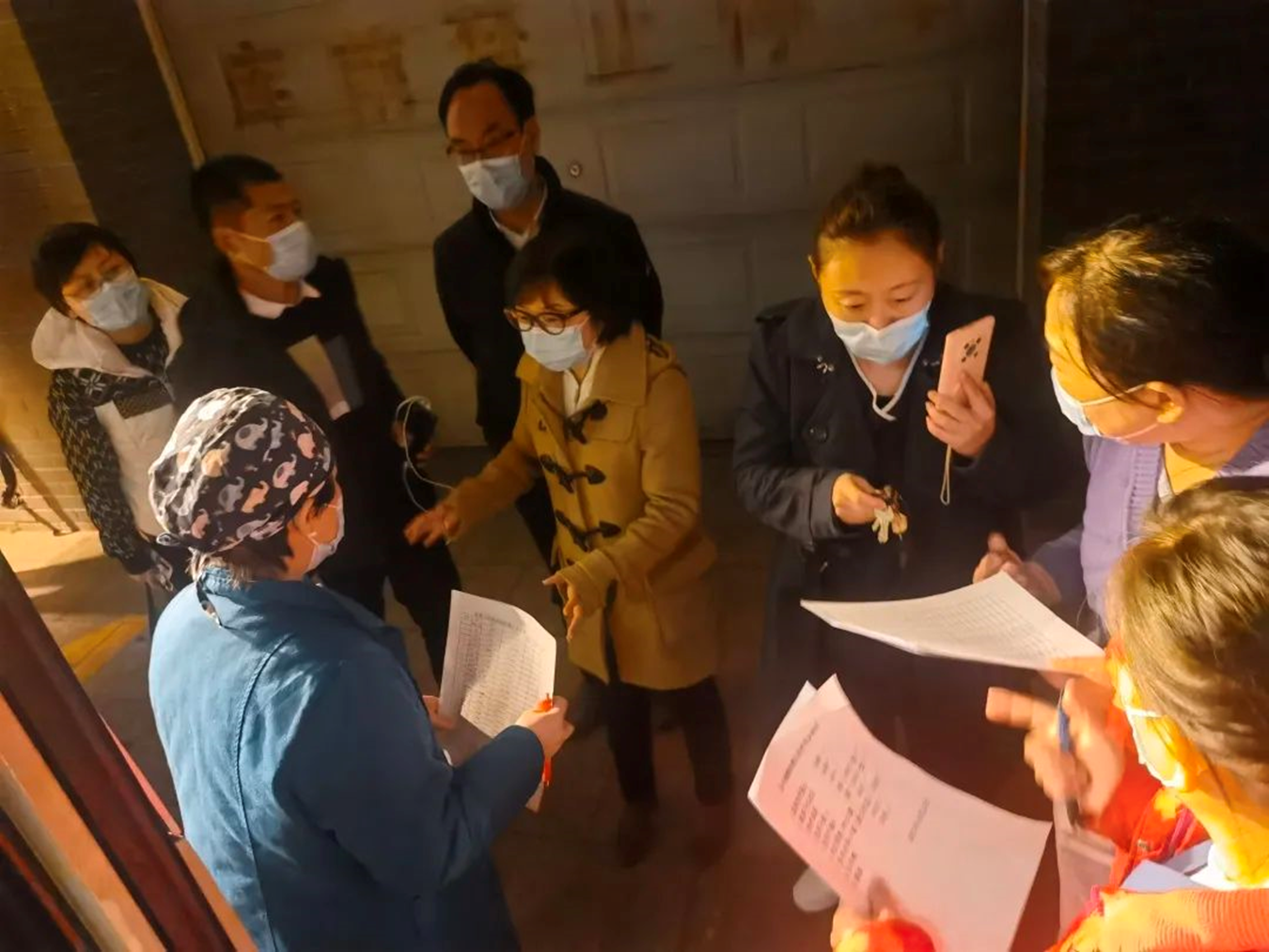 晚八點(diǎn)半,采樣隊(duì)在北七家鎮(zhèn)政府及市衛(wèi)健委工作組的統(tǒng)籌協(xié)調(diào)下,抵達(dá)蓬萊公寓核酸采樣點(diǎn),等待檢測(cè)的人群已排起長(zhǎng)龍。采樣隊(duì)第一時(shí)間對(duì)接社區(qū)工作組,通過規(guī)劃出入口路線、制定掃碼待檢流程、建立協(xié)調(diào)分組秩序等有效的工作機(jī)制,迅速擬定出有序的工作方案并投入戰(zhàn)斗。