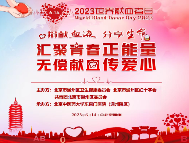 2023年6月14日是第20個(gè)世界獻(xiàn)血者日。為深入推進(jìn)學(xué)習(xí)貫徹習(xí)近平新時(shí)代中國(guó)特色社會(huì)主義思想主題教育,貫徹落實(shí)《北京市獻(xiàn)血條例》,按照《北京市通州區(qū)公民獻(xiàn)血委員會(huì)印發(fā)的<2023年通州區(qū)無(wú)償獻(xiàn)血工作實(shí)施方案>》要求,在世界獻(xiàn)血者日到來(lái)之際,北京中醫(yī)藥大學(xué)東直門(mén)醫(yī)院通州院區(qū)開(kāi)展了無(wú)償獻(xiàn)血活動(dòng)。