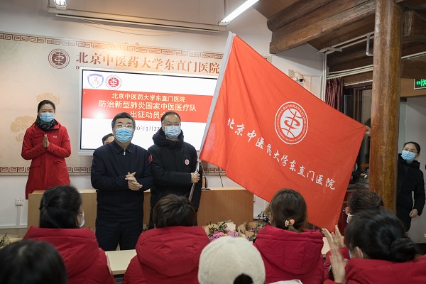 黨委書記葉永安為醫(yī)療隊(duì)隊(duì)長(zhǎng)、東直門醫(yī)院副院長(zhǎng)張耀圣授旗