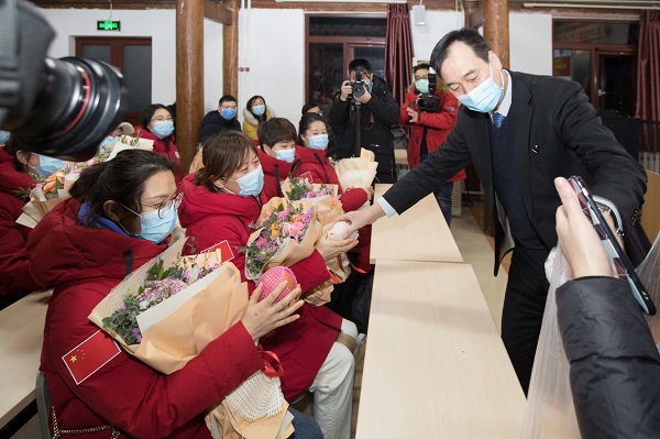 院領(lǐng)導(dǎo)為醫(yī)療隊(duì)友送上蘋果,寓意著“平安歸來”